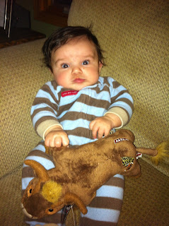 Also, the end of February (February 29, 2012 to be exact) Bo rolled over!! He rolled from belly to back. Josh and I hadn't really worked with him too much on this, but decided to try it out and he did it almost immediately! He did it 3 times so I, of course, captured the last 2 on video. Such a proud moment for Josh and I!:)